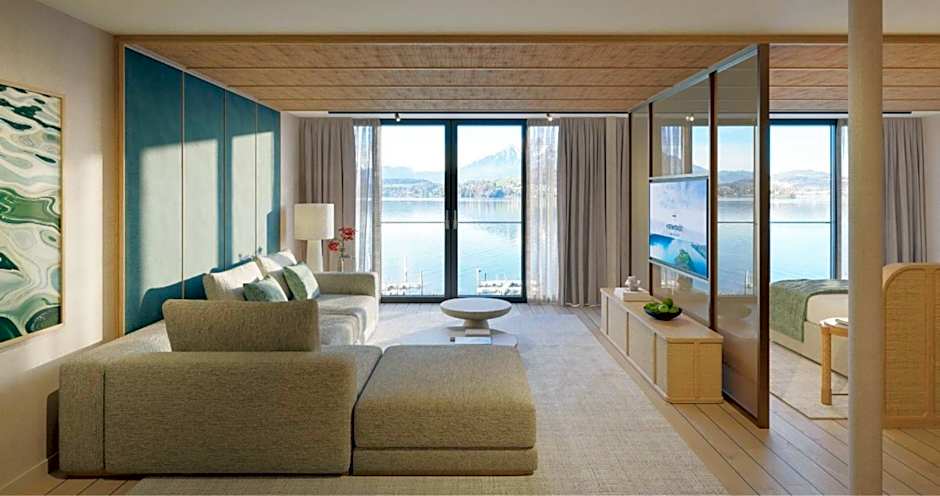 Top-floor suite in the new building offering panoramic views over the lake and the mountains and a comfortable seating area. It features an open-plan bathroom, a walk-in wardrobe and a Nespresso coffee machine. Free WiFi is available.